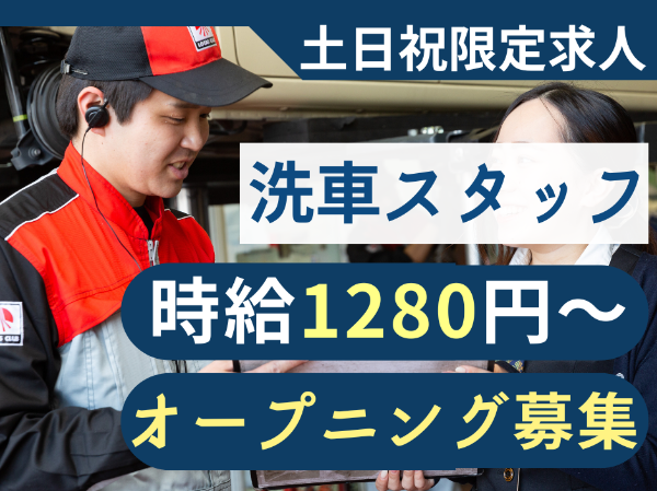 【洗車スタッフ|パート・アルバイト】 ■オープニングスタッフ■土日祝限定 ■高時給スタート■柔軟なシフト調整■1日5時間~OK!■未経験歓迎■制服あり■昇給あり■社食あり■マイカー通勤OK■交通費支給